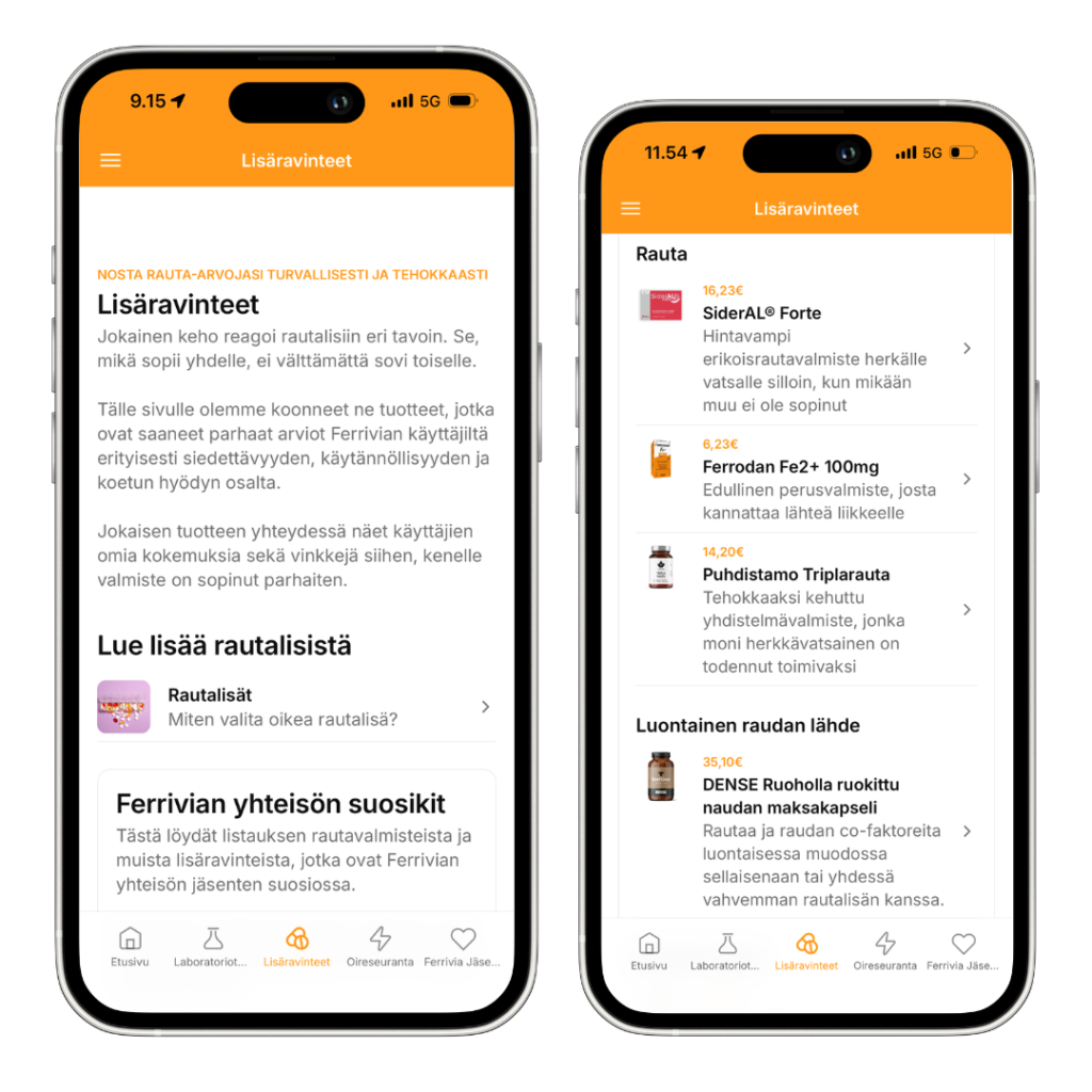 Tarvittaessa saat apua oikean rautalisän valintaan, sekä muiden Ferrivian käyttäjien suosituksia parhaista lisäravinteista.